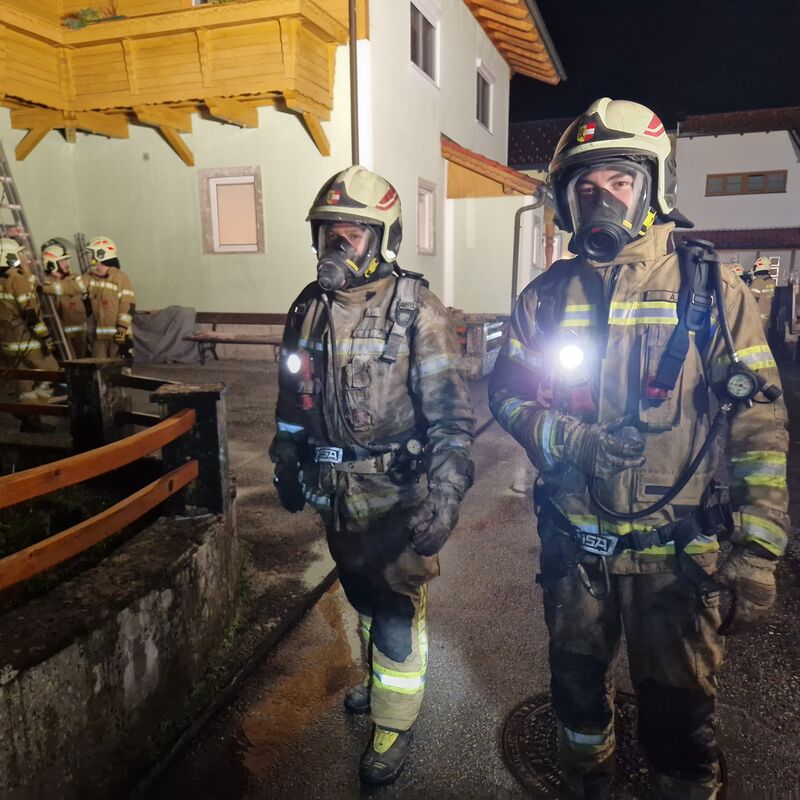 Ein Atemschutztrupp der FF Kuchl ging zur Brandbekämpfung vor, gleichzeitig wurde die Wasserversorgung von der nahegelegenen Salzach aufgebaut.