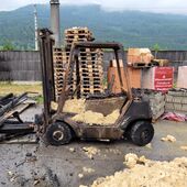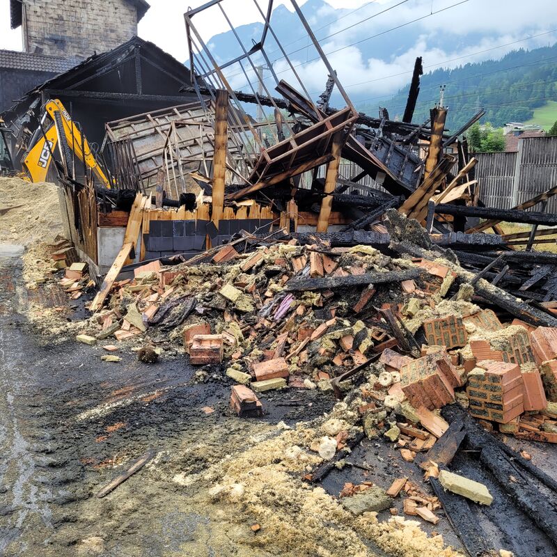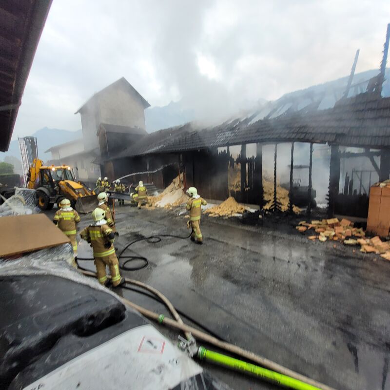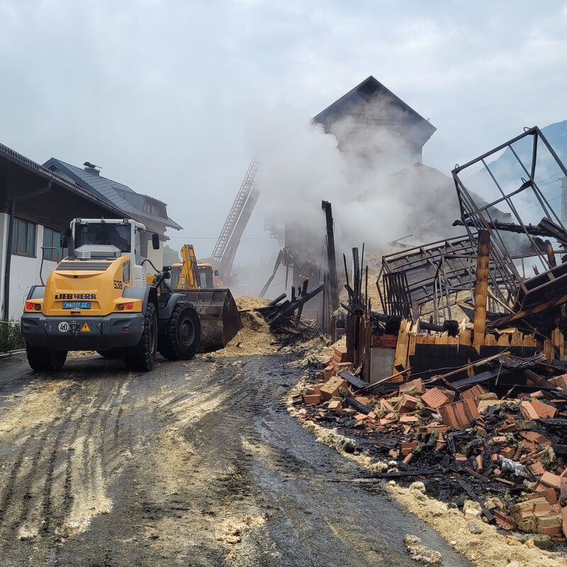 - Mit Radladerfahrzeugen der Gemeinde Kuchl und der Firma Struber Entsorgung wurden die Lagerhalle leergeräumt und die Glutnester abgelöscht.