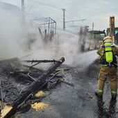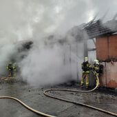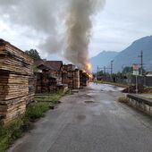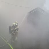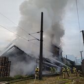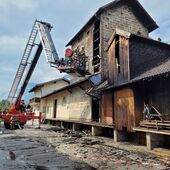 - Ein Teil des Daches der Lagerhalte wurde abgetragen, um die Holzbriketts auf einer offenen Fläche ablöschen zu können.