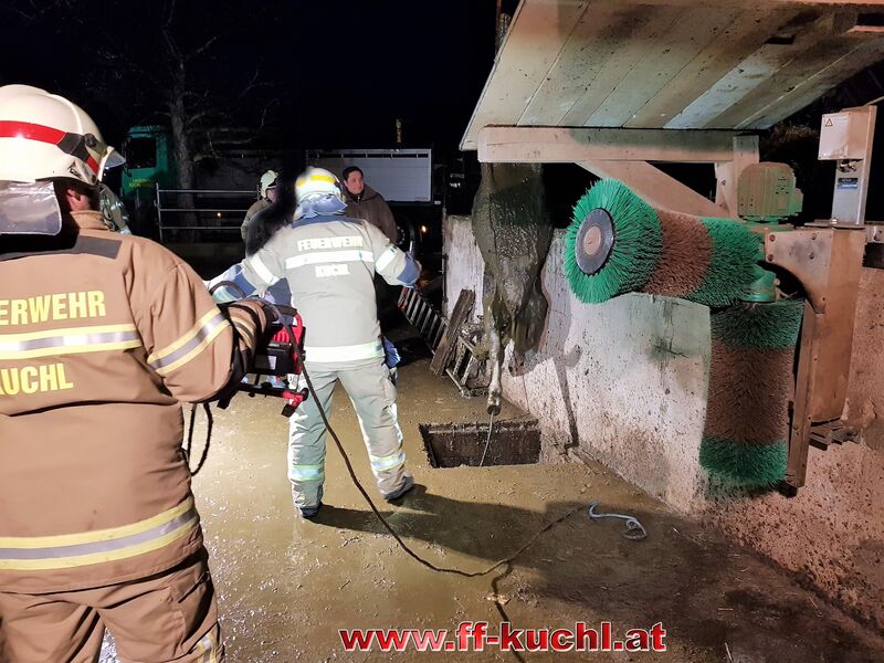In einem Freilaufstall in Kuchl stürzte vorerst unbemerkt ein Kalb in eine Güllegrube. Als die Bauersleute dies merkten, steckte das arme Tier bis zum Hals im Dreck. Die Freiwillige Feuerwehr Kuchl wurde per Rufempfänger alarmiert und rückte mit vier Fahrzeugen zum Einsatzort in Georgenberg aus.