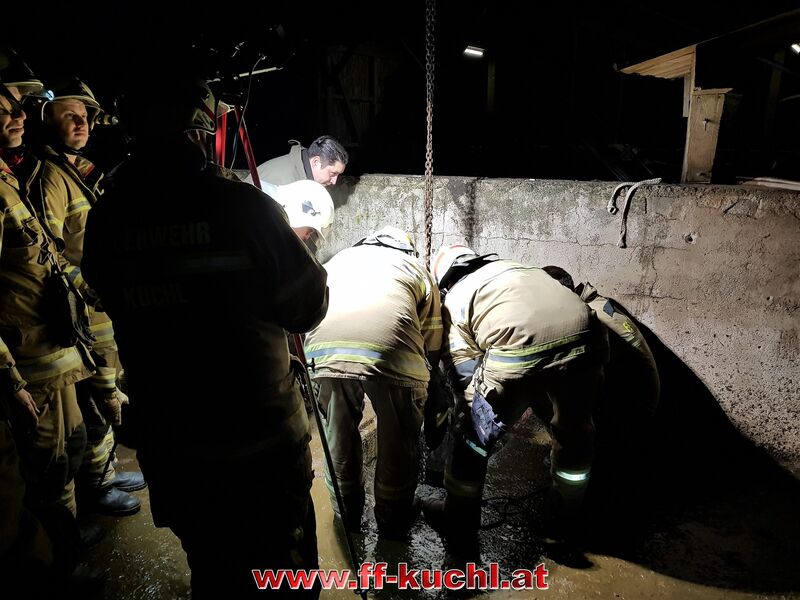 Nach Erkundung der Lage wurde eine Tierärztin und ein Kran des Kuchler Lagerhauses informiert. Ein Trupp mit schwerem Atemschutz stieg in die tiefe Grube. Das Tier wurde mit einer Spritze beruhigt. Unter schwierigen Umständen wurden breite Riemen an den Hinterfüßen angebracht und anschließend das ca. 200 kg schwere Kalb mit dem Kran so schnell als möglich aus der Grube geholt.