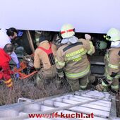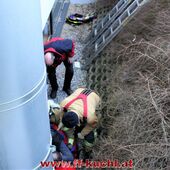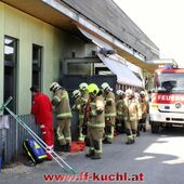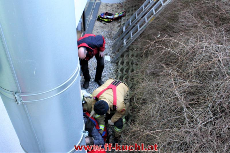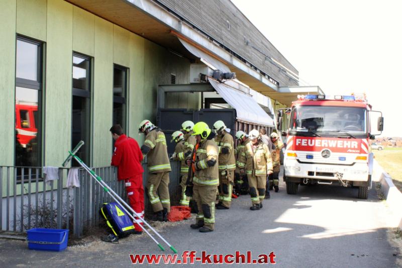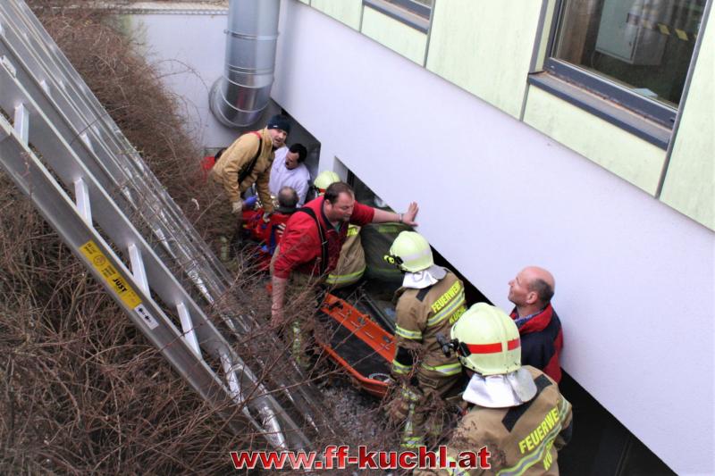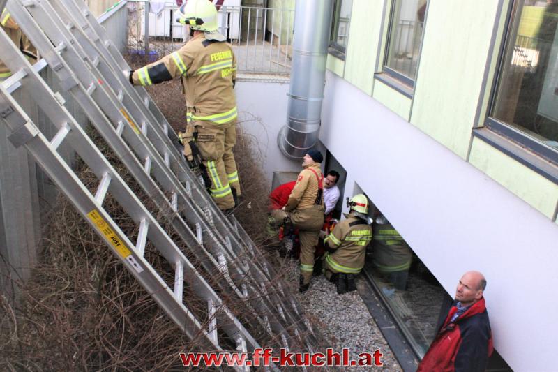 Ein Arbeiter war beim Fenster reinigen ca. 3 Meter in die Tiefe gestürzt und zog sich dabei Verletzungen im Schulter- und Beinbereich zu. Zusammen mit dem Roten Kreuz und dem Notarzt wurde der Patient erst versorgt und anschließend mit der Korbtrage über das Fenster gerettet.