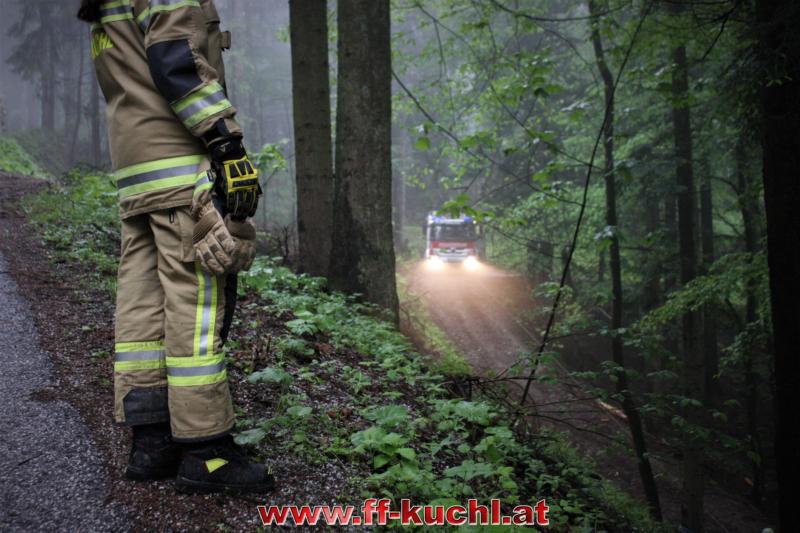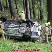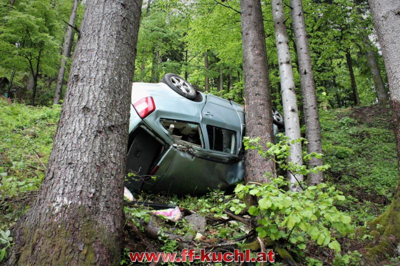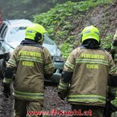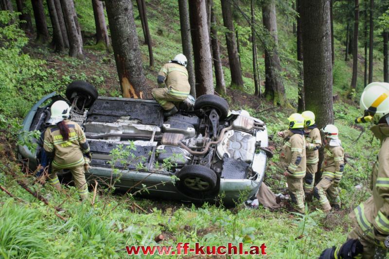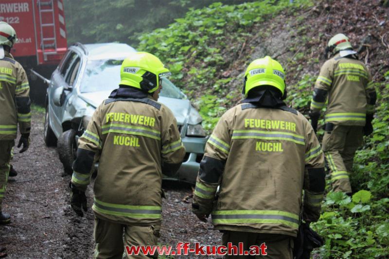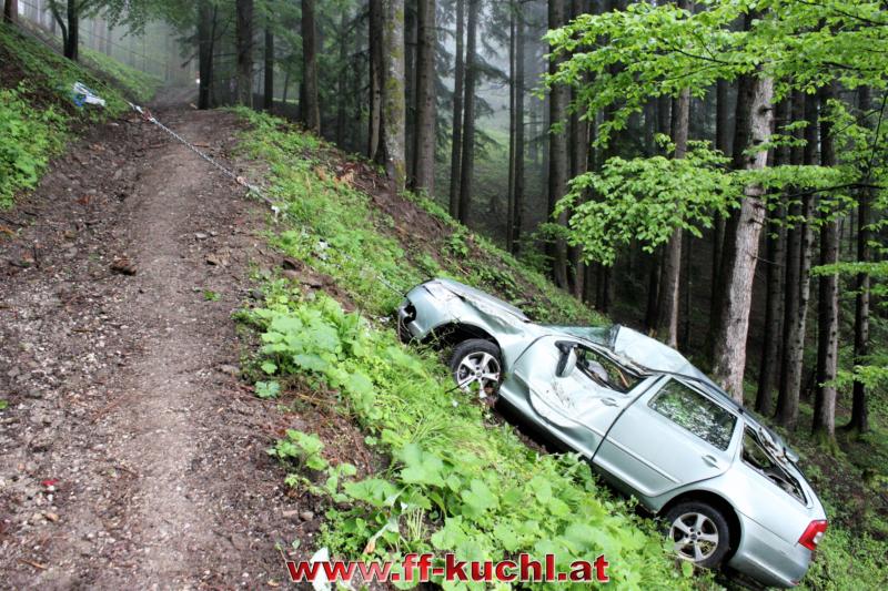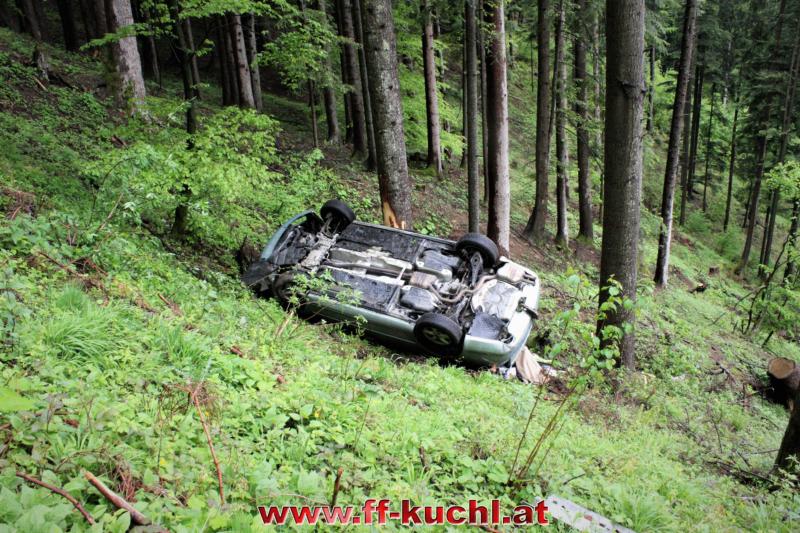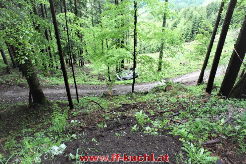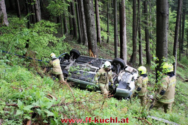 Kurz nach 12:00 Uhr meldete die Landes-, Alarm- und Warnzentrale Salzburg den Absturz eines Fahrzeuges im Scheffauer Ortsteil Moosegg. In kürzester Zeit fuhren Kommando -, Rüstlösch - und Tank Kuchl, sowie Pumpe 1 Jadorf zum ca. 7 km entfernten Einsatzort. Zusätzlich wurde der Scheffauer Ortsfeuerwehrkommandant verständigt.
