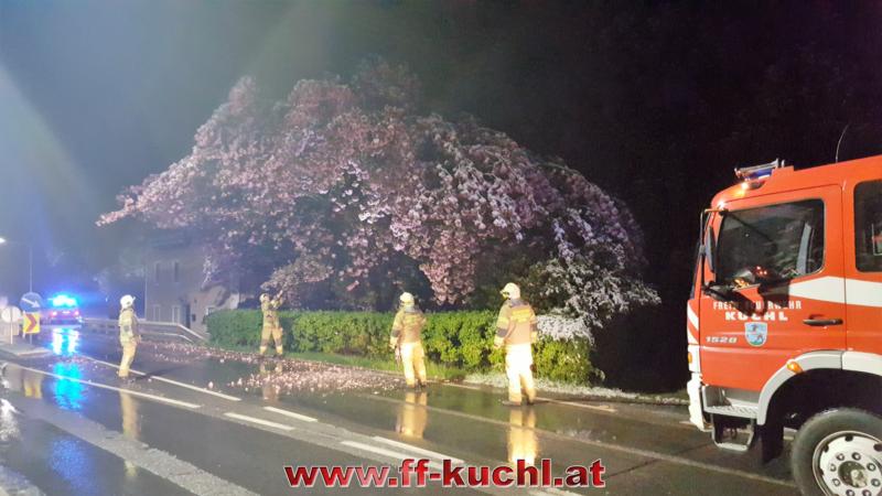 An der Bundesstraße 159, kurz vor der Seppenbauernkreuzung in Kuchl, hatten sich die in Vollblüte stehenden Zweige eines sehr alten Obstbaumes durch die Schneelast so weit gesenkt, dass ein LKW diese streifte. Der LKW-Fahrer meldete über Notruf 122 den Vorfall der Landes-, Alarm- und Warnzentrale Salzburg und diese löste für die Feuerwehr Kuchl Alarm aus.