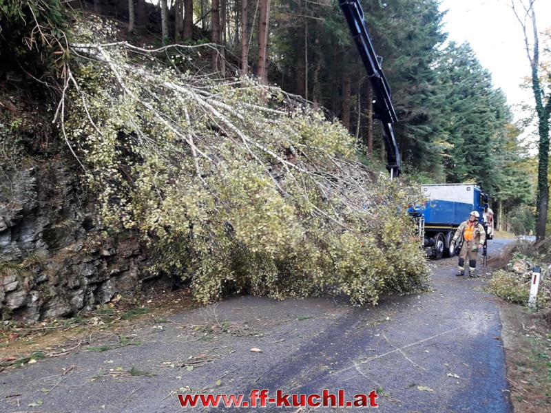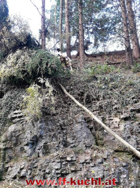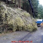 In Unterlangenberg mussten Baumteile entfernt werden und auf der St. Kolomaner Landesstraße hatte ein Baum das Auto eines Landwirtes getroffen und schwer beschädigt. Der Fahrer bleib glücklicherweise unverletzt. Die Bäume wurden in mehrere Teile zerschnitten, mit Hilfe eines Kranes von der Straße entfernt und diese gesäubert.