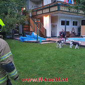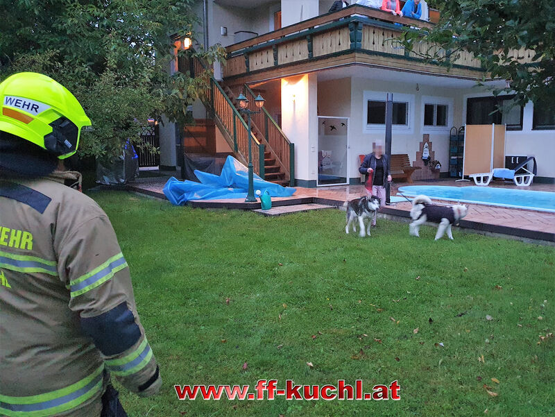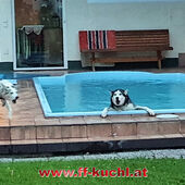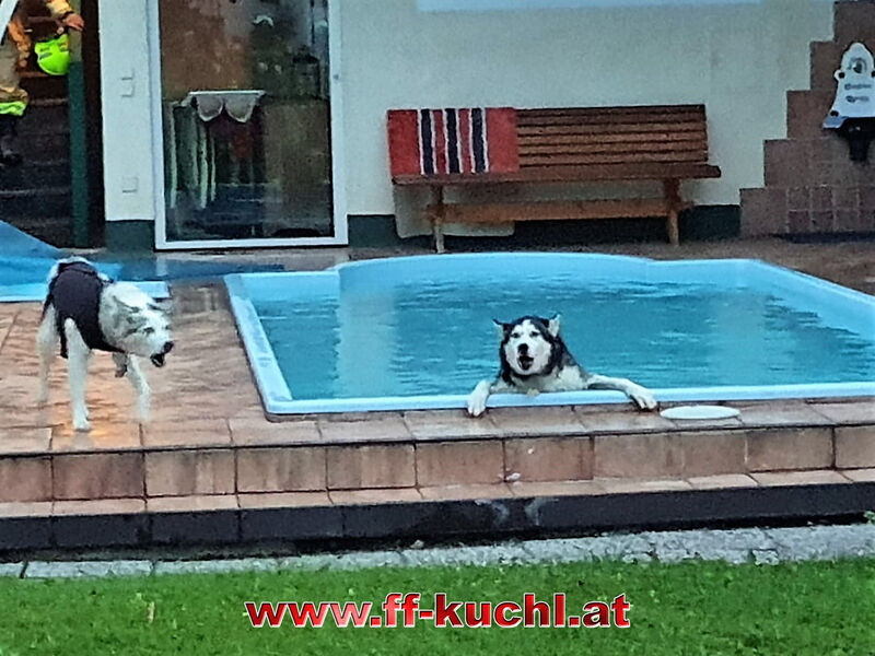 Beim Eintreffen stellte sich dem Einsatzleiter folgende Lage: Ein Husky war in einem privaten Swimming-Pool ins Wasser gefallen und lehnte ziemlich erschöpft am Poolrand. Heraußen stand daneben ein weiterer Husky und zeigte deutliche Anzeichen einer Schutzaggression. Er bellte die Einsatzkräfte scharf an, fletschte die Zähne und wollte damit seinen Leidens- und Rudelsgenossen schützen.