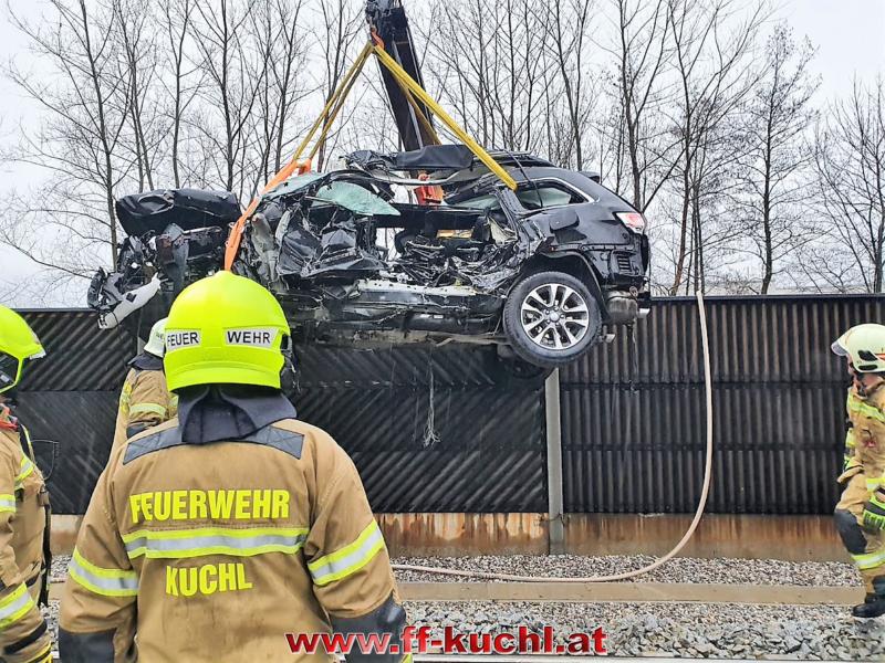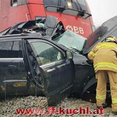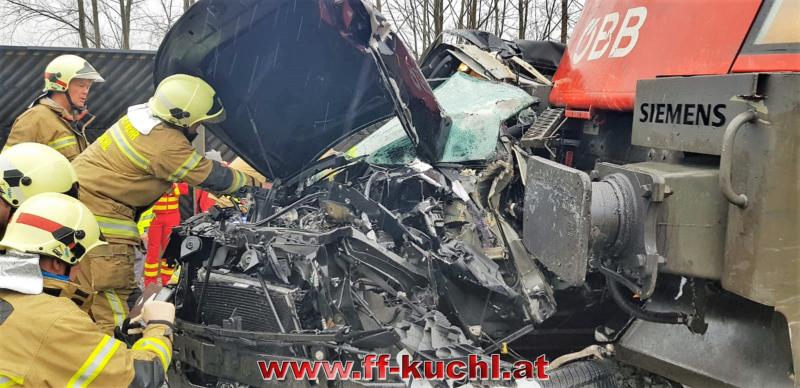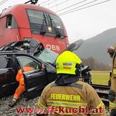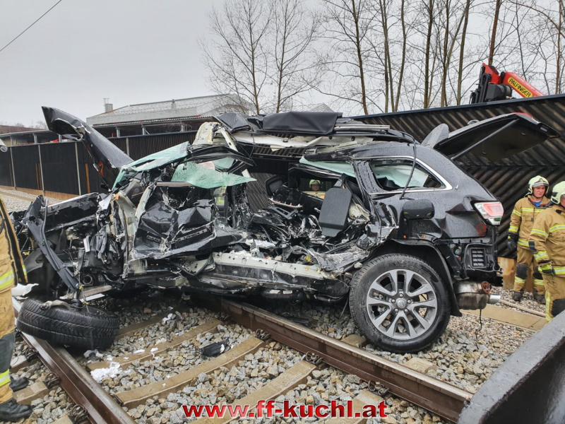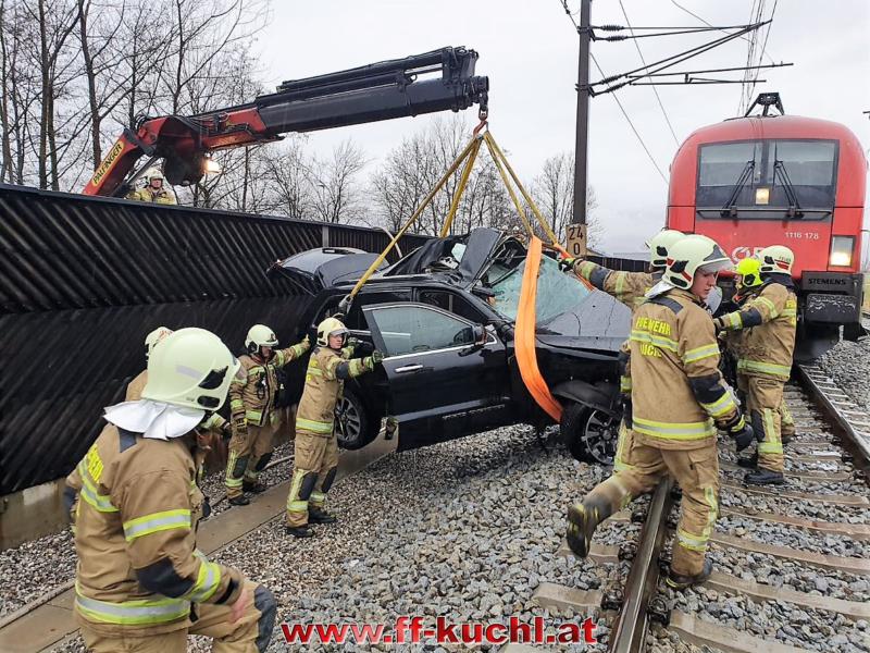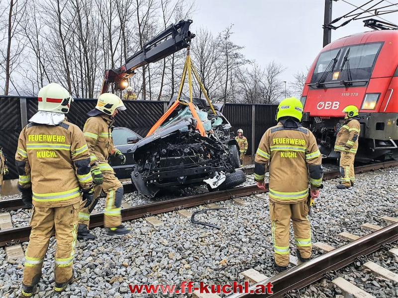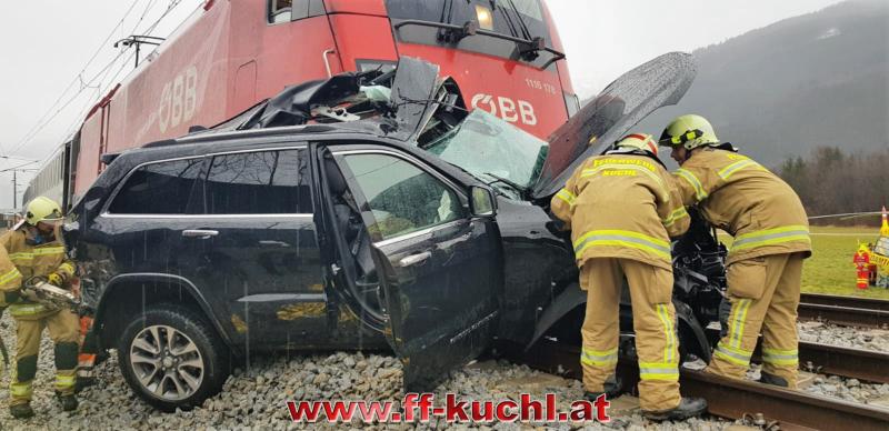 Die Einsatzkräfte der Freiwilligen Feuerwehr Kuchl und des Roten Kreuzes erreichten ziemlich zeitgleich den Einsatzort - einem mit Schranken und Signalanlage gesichertem Bahnübergang an der ÖBB-Tauernstrecke. Aus unbekannter Ursache war ein Geländewagen mit deutschem Kennzeichen in den Gleisbereich eingefahren und trotz Vollbremsung durch den Lokführer vom Zug erfasst und ca. 100 Meter weit mitgeschleift worden.
