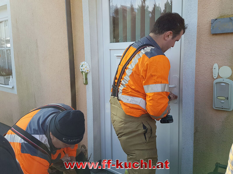 Von der Polizei Golling wurde die Freiwillige Feuerwehr Kuchl zu einer Türöffnung alarmiert. Eine Pensionisten, deren Ehemann erst kürzlich verstorben war, hatte sich nicht mehr gemeldet. Bei der Polizeikontrolle konnten die aufmerksamen Beamten einen schwachen Hilferuf feststellen.
