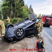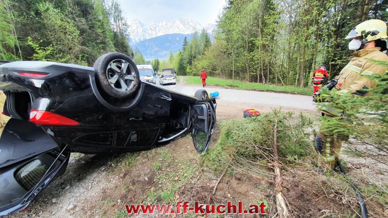 Beim Eintreffen der Einsatzkräfte lag das verunfallte Fahrzeug neben der Straße auf dem Dach.